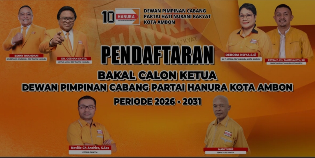 Ambon, Malukuexpose.com – Genderang suksesi kepemimpinan di tubuh Partai Hati Nurani Rakyat (Hanura) Kota Ambon resmi ditabuh. Terhitung mulai Senin (30/03/26), Panitia Penjaringan resmi membuka pendaftaran bagi Bakal Calon Ketua DPC Hanura Kota Ambon untuk masa bakti 2026-2031.